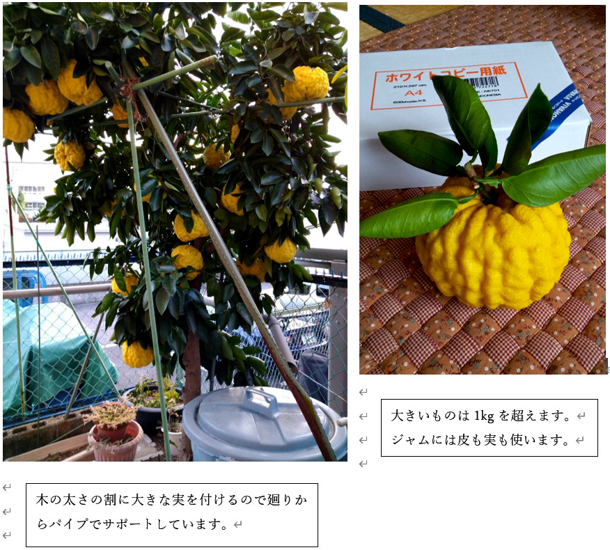 和歌山はミカンの産地でその種類も多く、大阪では見たことも、聞いたこともない外観、名前のミカン、ユズの種類が店頭に並びます。数種類は買って食べてみたのですが、少しずつ味、香りが違います。いろいろ品種改良が進んでいます。只、大阪の我が家に15年程育っているシシユズはどこにも見かけません。地元の人も見たことはない様です。多分、もっと西の方、九州、四国で育つ品種なのでしょう。この木は私が単身赴任をしていた山口県のマーケットで苗を買って大阪の家に持って帰ったものです。苗を植えて7年目でようやく実を付けました。それまでは花も咲かない、実もならない、葉っぱだけの状態で、別の木に変えようか?と思った時もありました。(昔よりモモ、クリ、3年、カキ8年、ユズのおおバカ18年ということわざもあります)  それ以後、毎年コンスタントに実り、数も増えて今は30ヶぐらいが密集状態で一本の細い幹の周りに重たそうにぶら下がります。シシユズのジャムを作り配るのが12月初め頃の恒例行事となりました。1ケの実と皮で相当量のジャムが出来ますので。移住先の皆さんにも配っています。ジャム作り作業は家内のテレトリーとなっています。