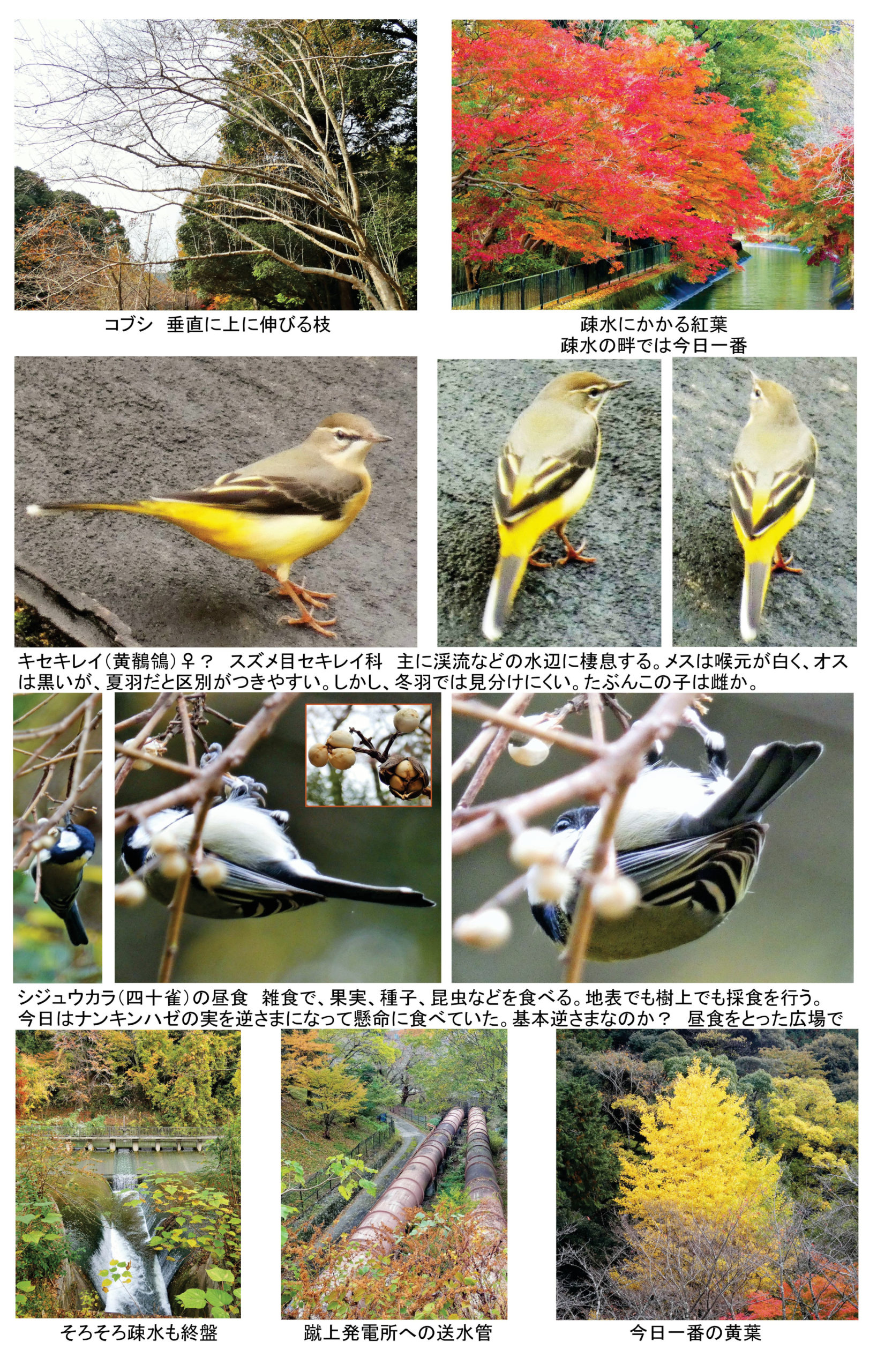 今回は、紅葉と疏水に気をとられ、自然観察特に植物観察が疎かになったことを反省しています。また、あいにくの曇天のため、写真全般に光・色彩補正をかけてあります。紅葉の美しさを強調したかったため。